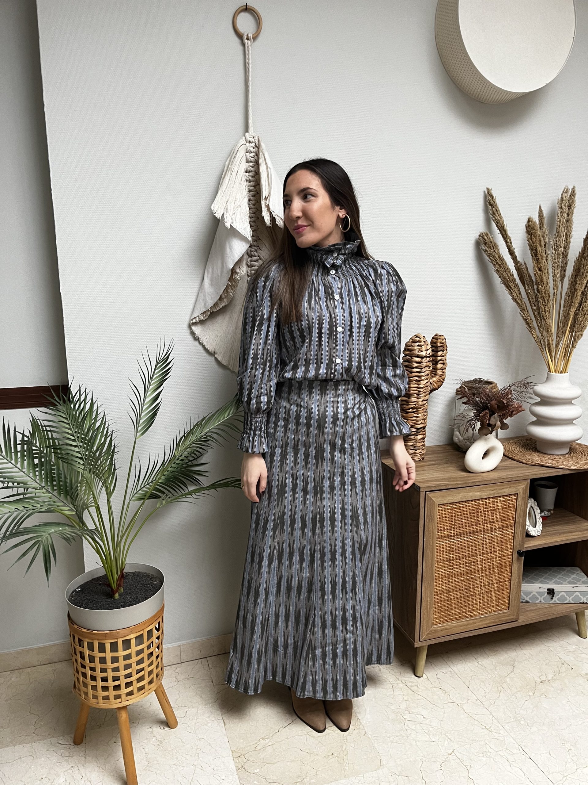 Conjunto de camisa y falda de rayas con un tacto suave. La camisa tiene cierre de botones delanteros y la falda tiene cintura trasera elástica para ajustarse mejor y presenta un corte fluido.